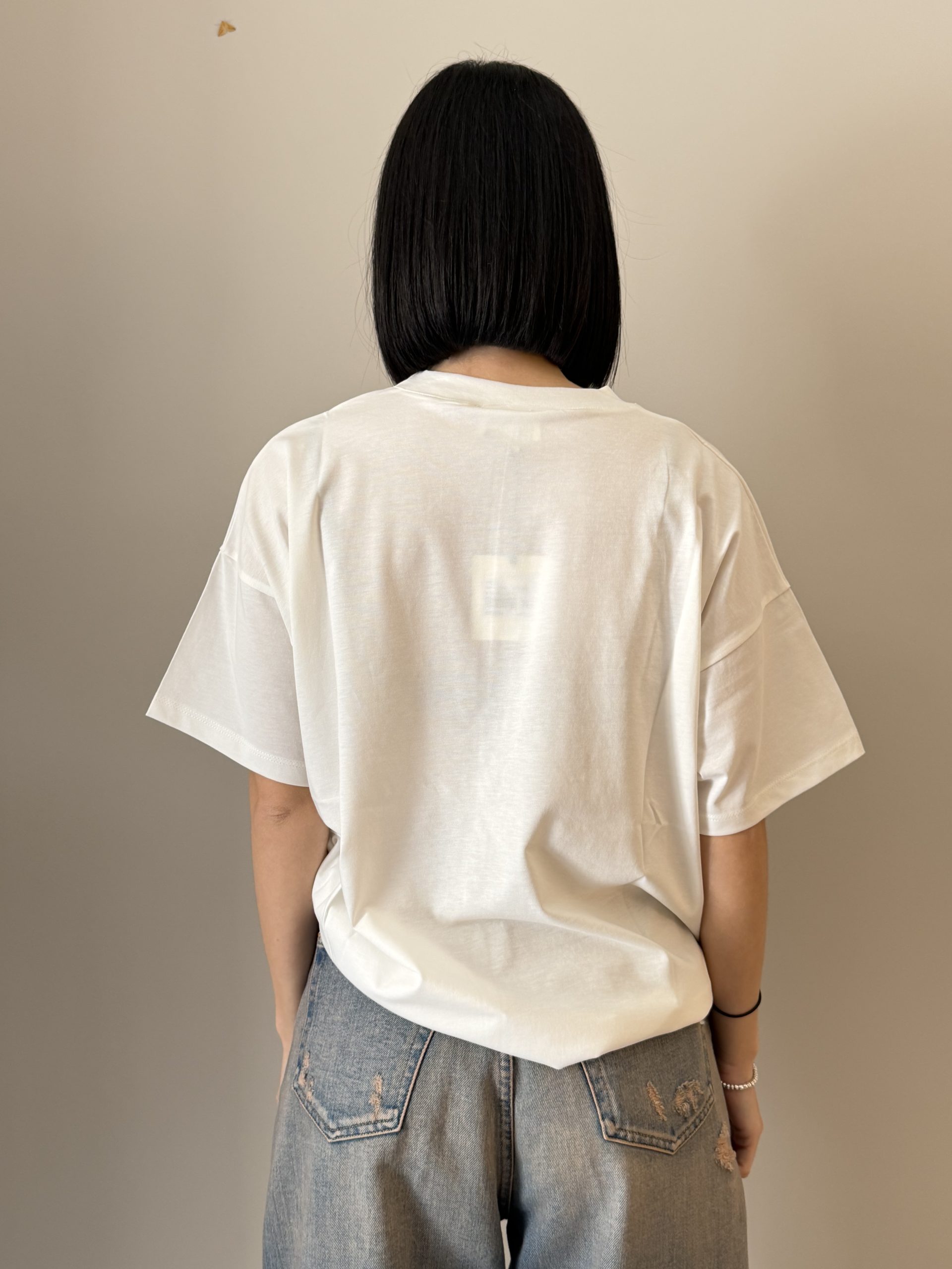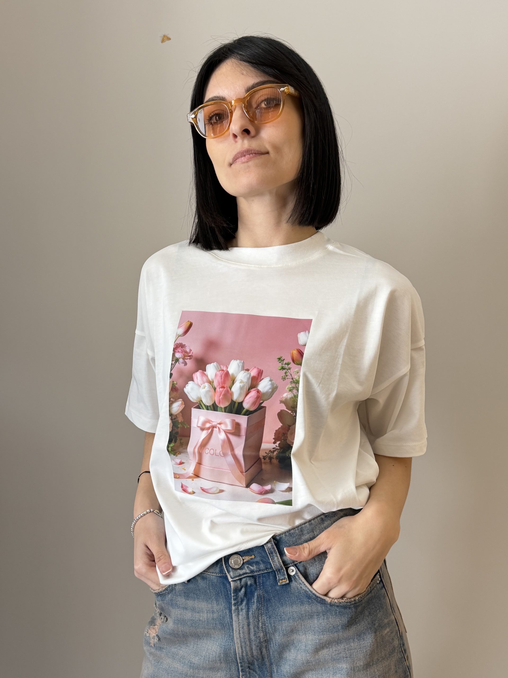 Vicolo T-shirt dal design essenziale arricchita da una stampa frontale decorativa che dona personalità al capo. La linea pulita e il tessuto in cotone garantiscono comfort e versatilità, rendendola perfetta per look casual e contemporanei.