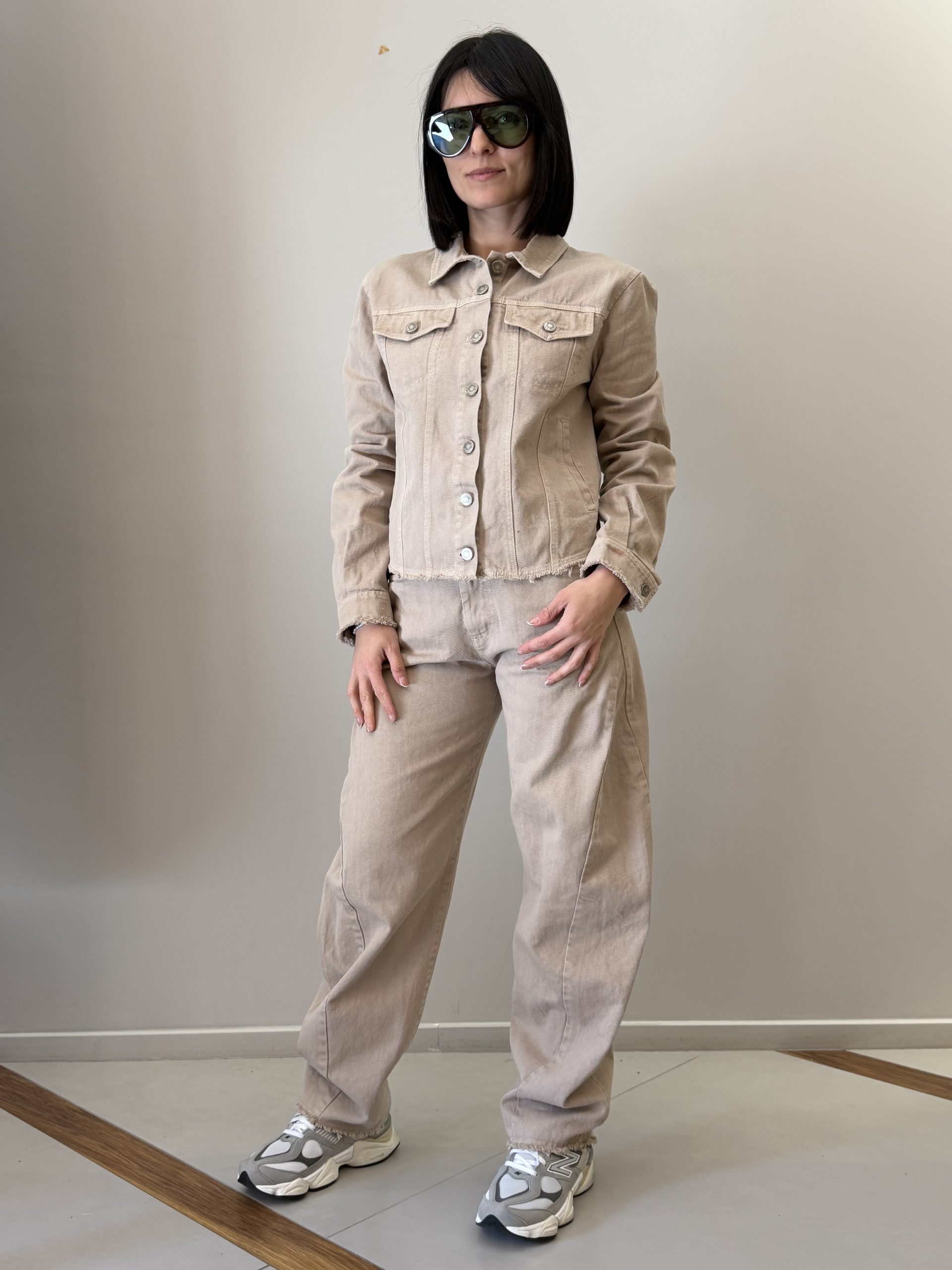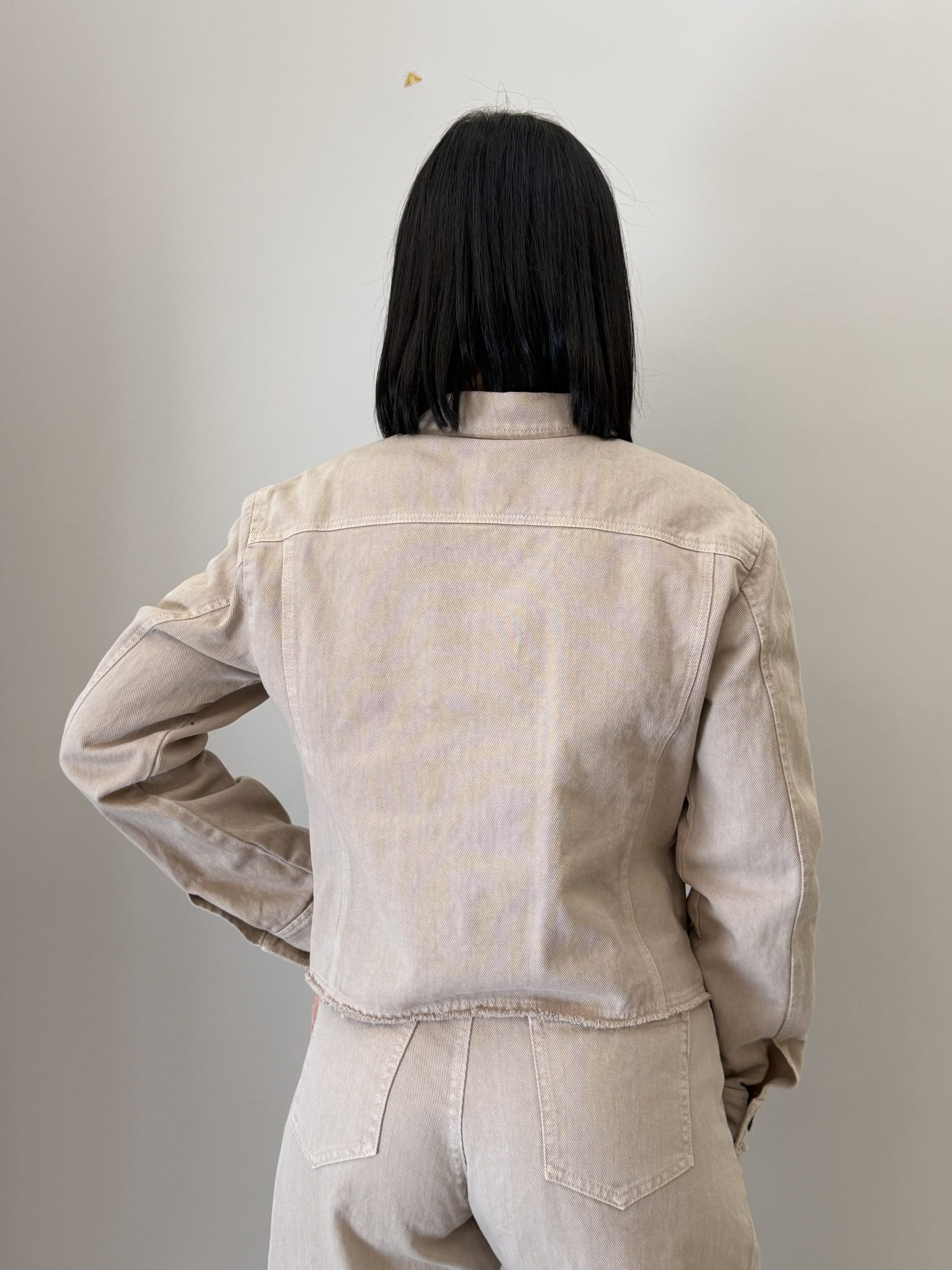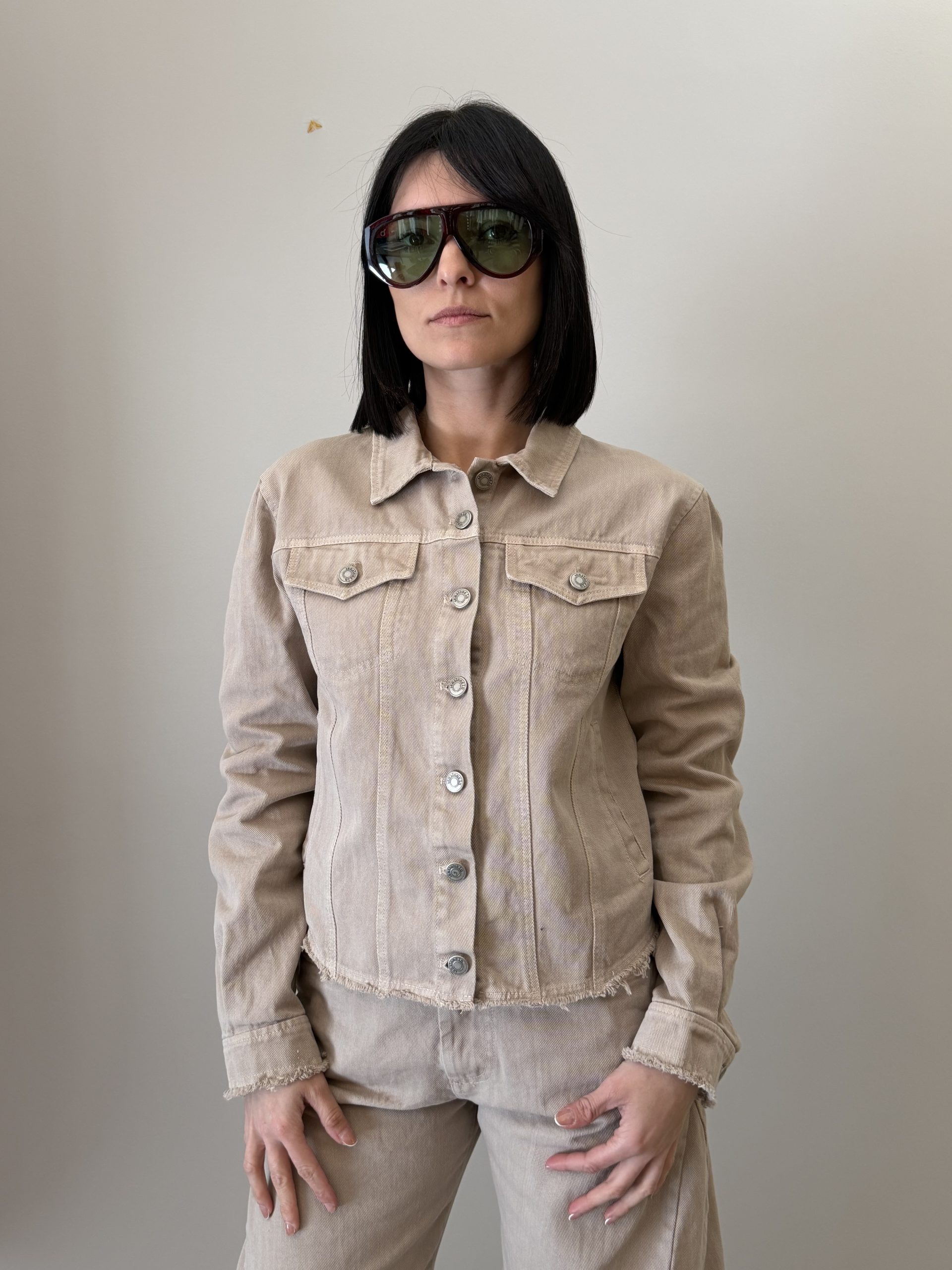 Tensione In Giacca corta dal design essenziale, caratterizzata da una linea pulita e moderna. Il modello presenta colletto classico, chiusura frontale con bottoni e tasche applicate sul petto che richiamano l’estetica casual. Il fondo leggermente sfrangiato aggiunge un tocco contemporaneo al capo, rendendolo perfetto per completare look quotidiani con stile.