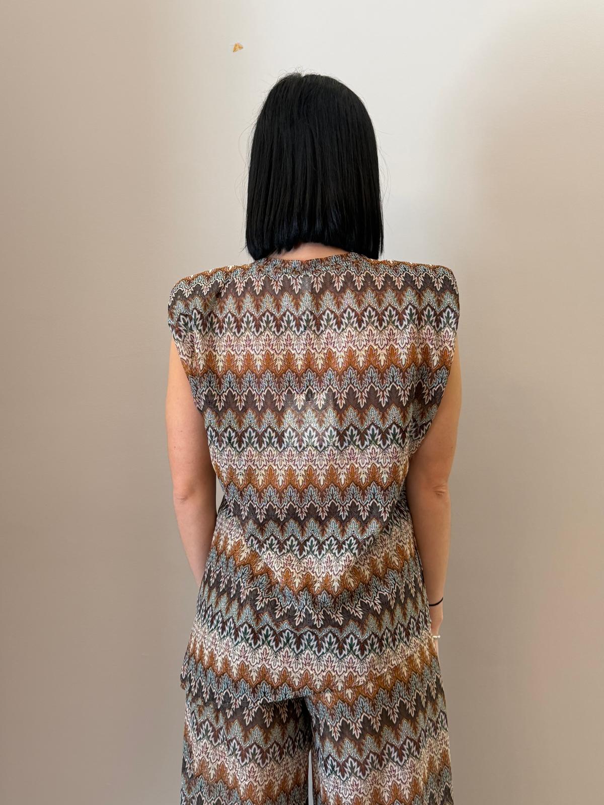 Un capo elegante e contemporaneo che illumina il look con discrezione. Questa maglia smanicata si distingue per la lavorazione in viscosa con filo lurex, che dona al tessuto una luminosità raffinata senza risultare eccessiva.