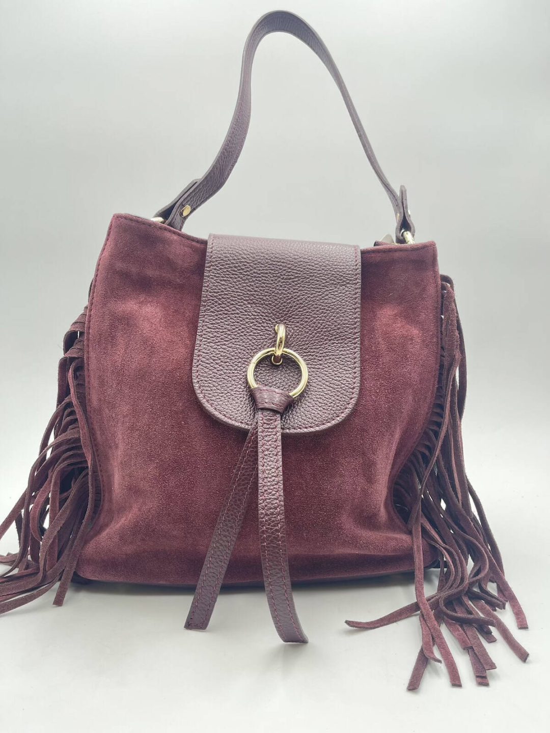 Dress17 borsa in vera pelle scamosciata con frange laterali, dal design morbido e struttura capiente. Chiusura superiore con zip e pattina decorativa frontale con dettaglio ad anello. Dotata di manico in pelle e tracolla regolabile e removibile.