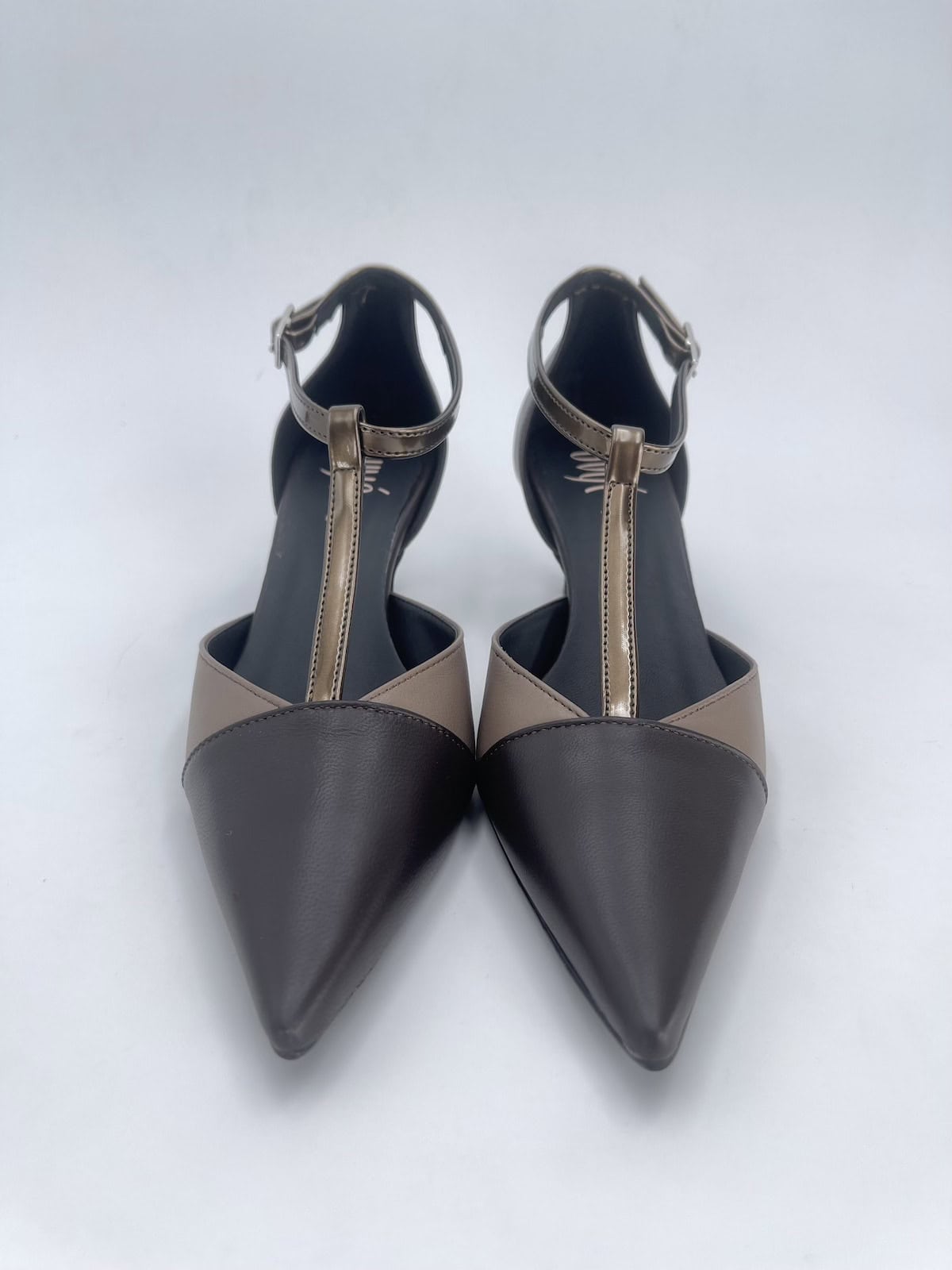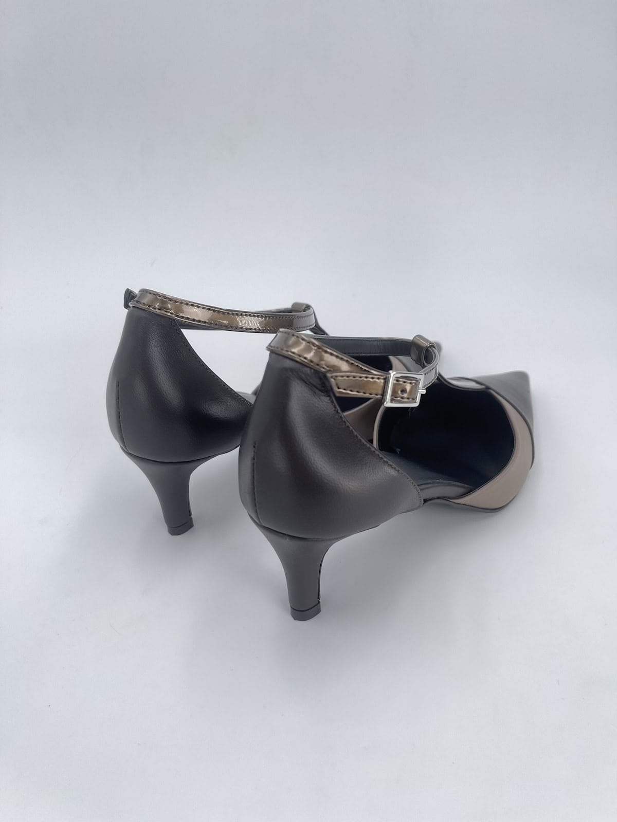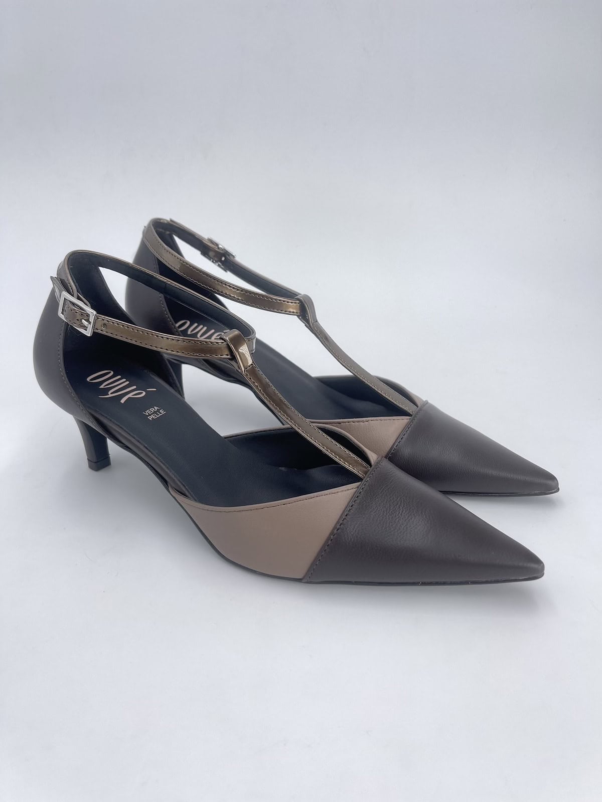 Ovyé slingback in pelle con punta affusolata e cinturino alla caviglia regolabile. Tacco a rocchetto di circa 6 cm.