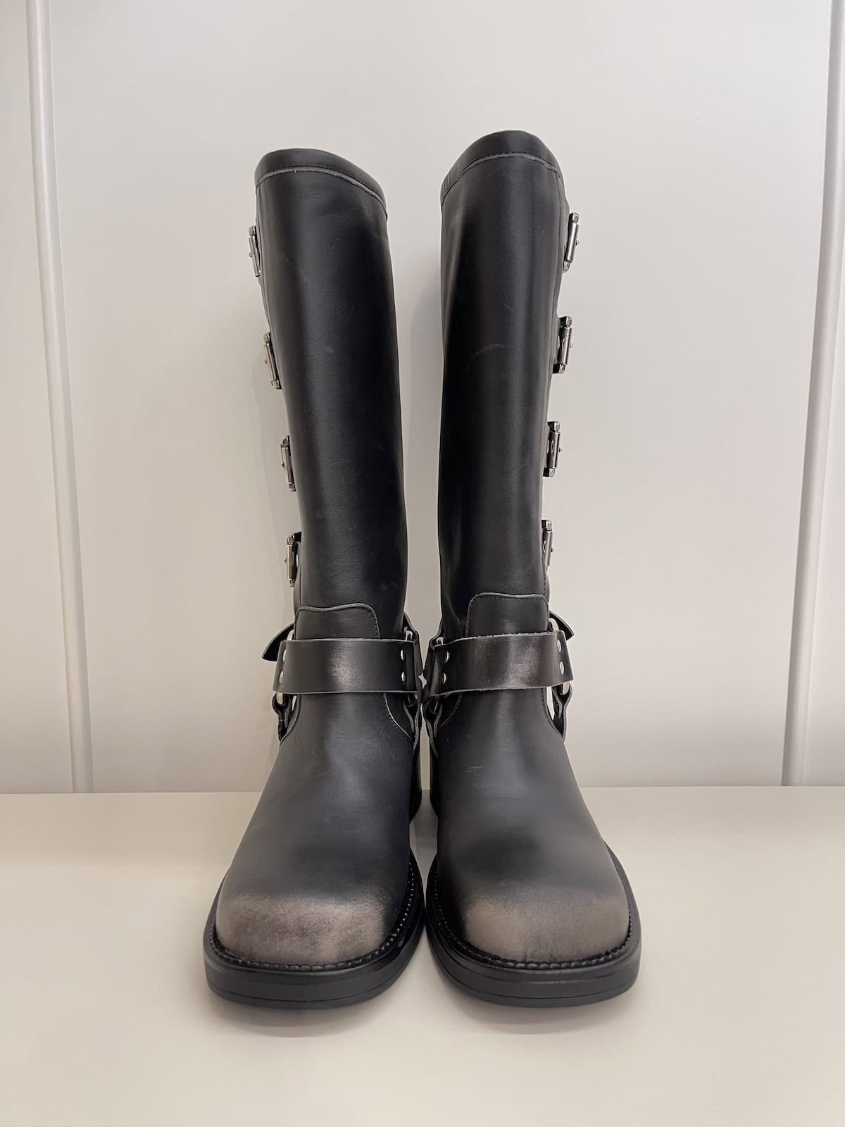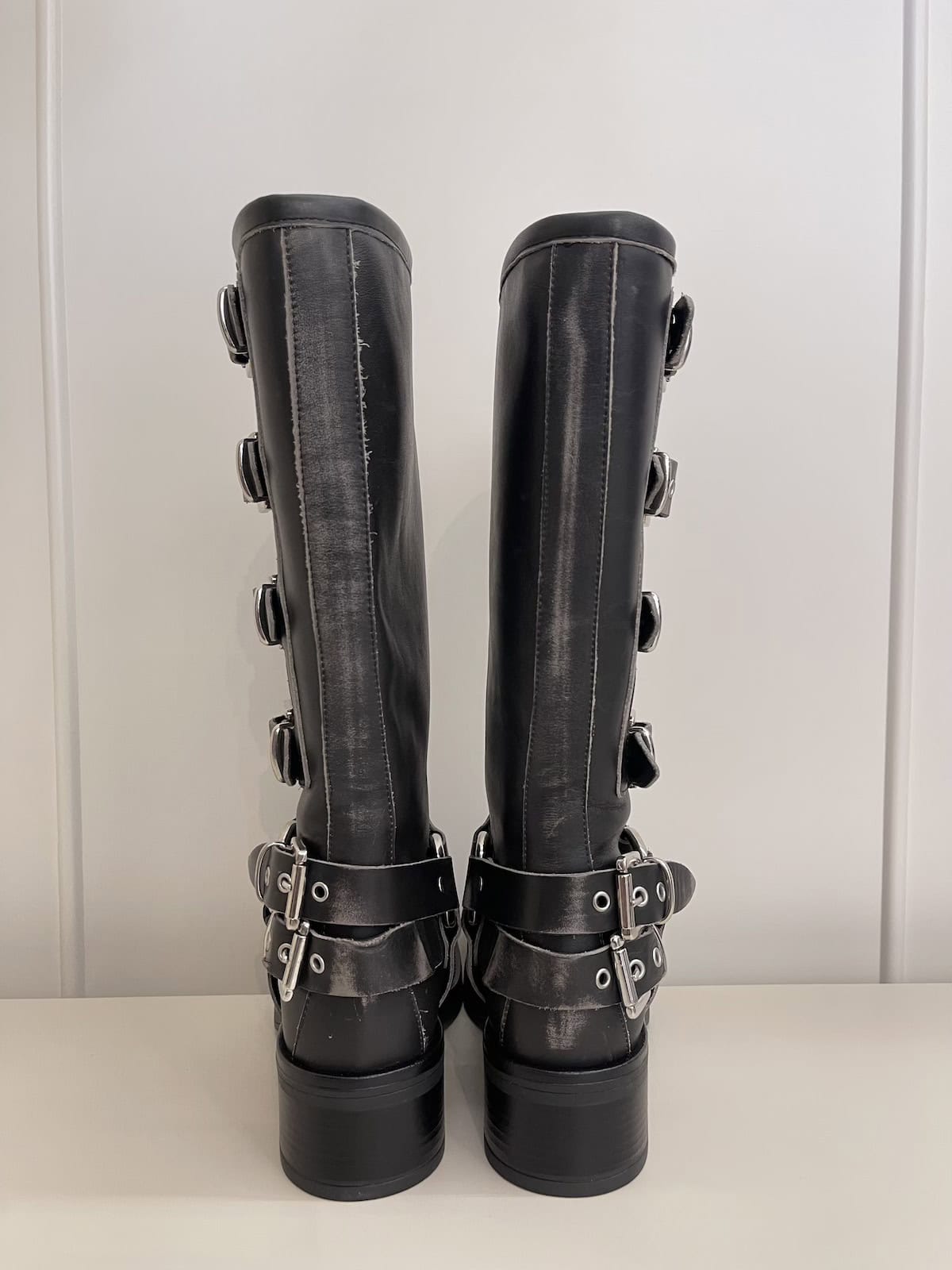 Ovyé stivali alti in pelle effetto vintage con cinturini multipli e fibbie argentate. Suola strutturata e tacco basso.