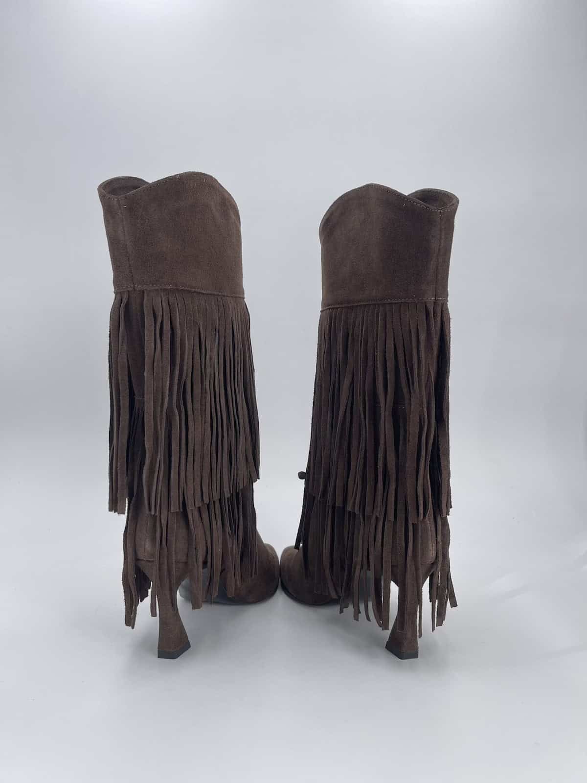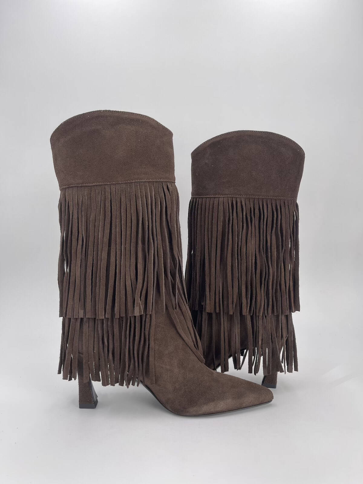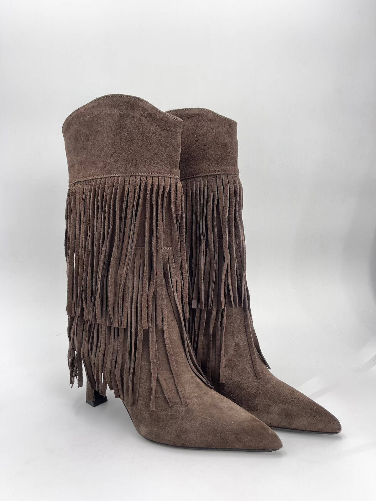 Ovyé stivali in camoscio con punta affusolata e gambale alto decorato da frange laterali. Tacco a cono di circa 7 cm