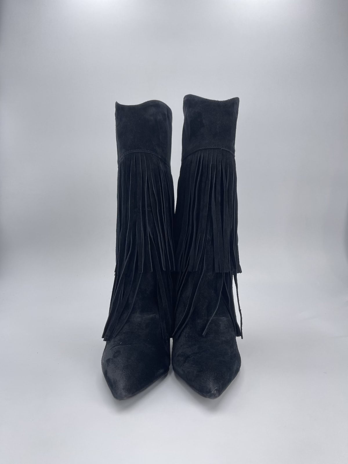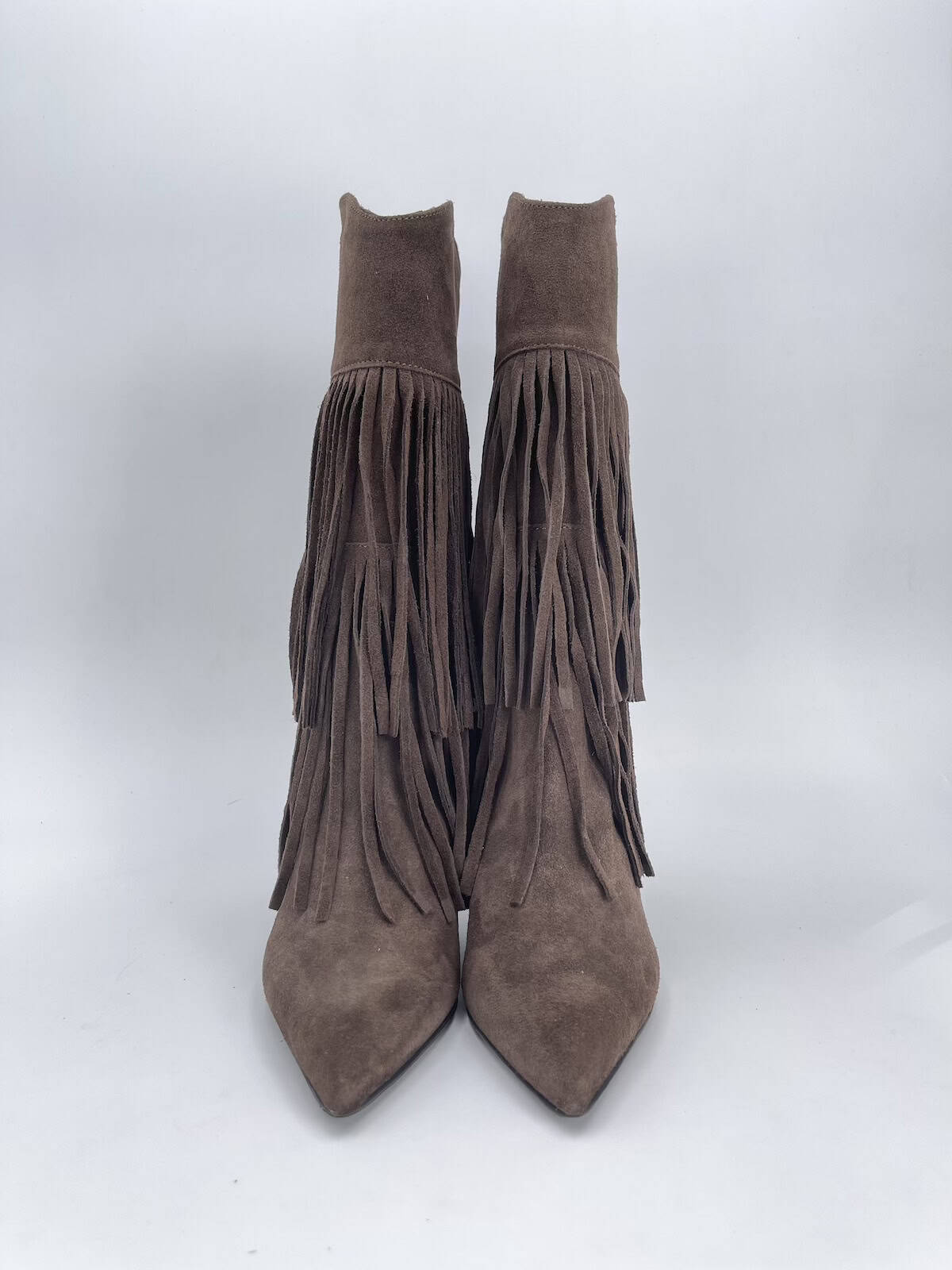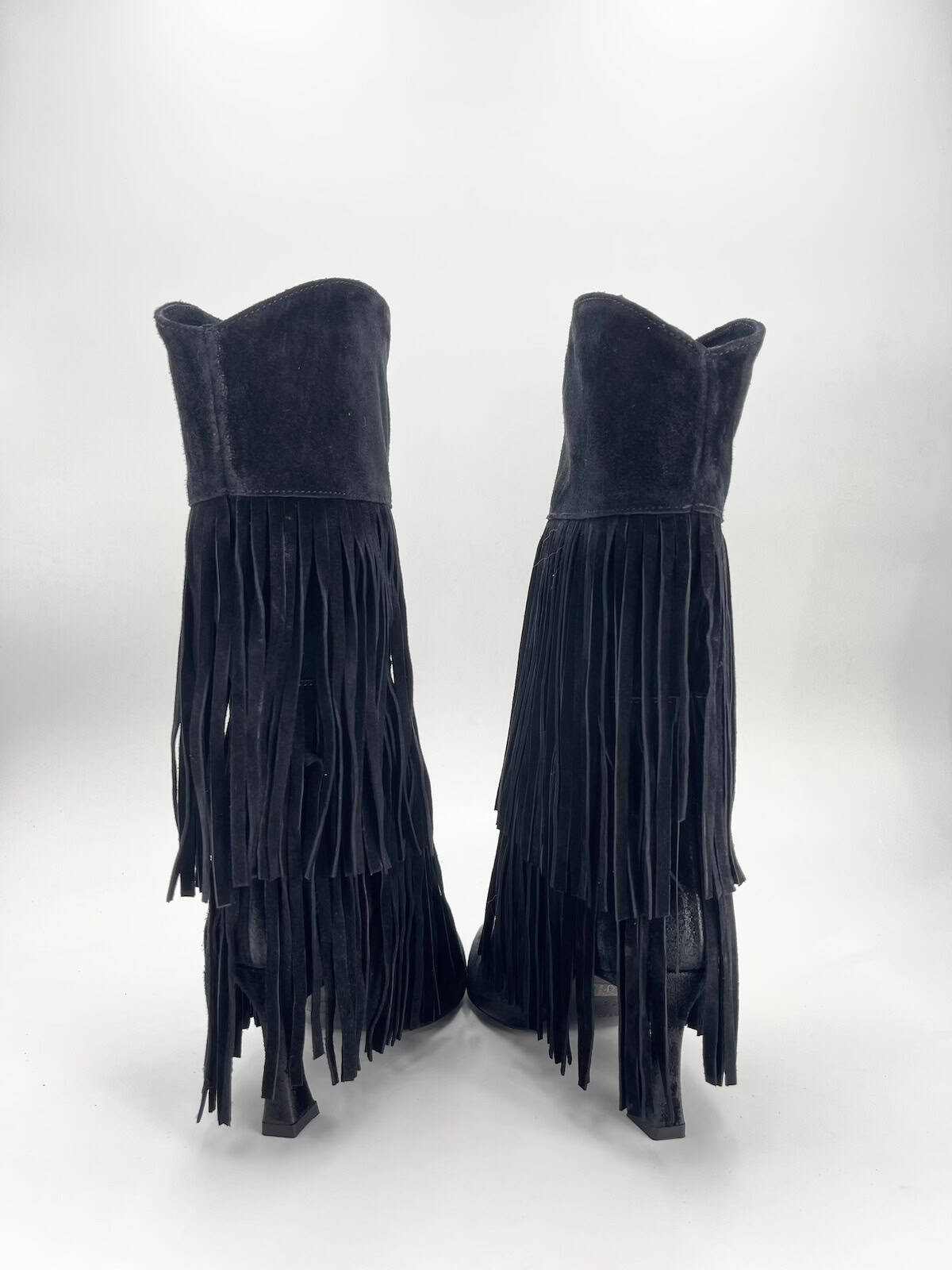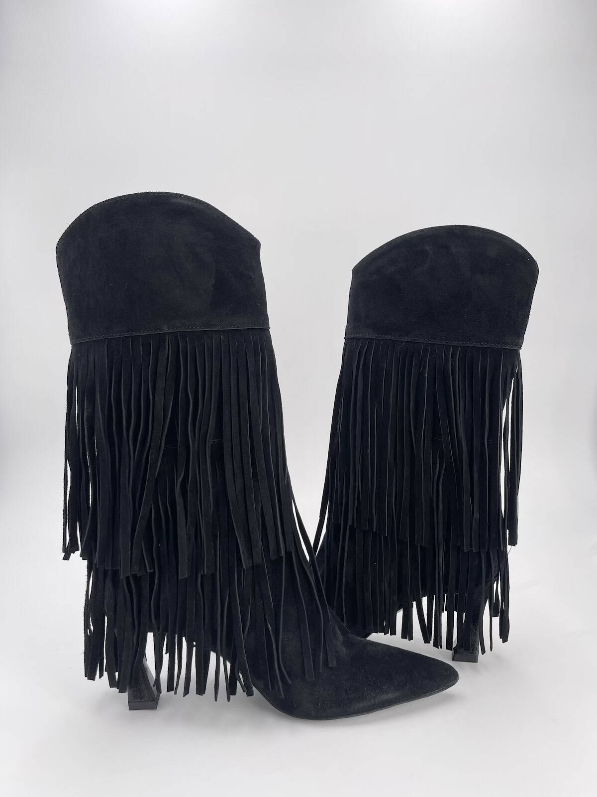 Ovyé stivali in camoscio con punta affusolata e gambale alto decorato da frange laterali. Tacco a cono di circa 7 cm