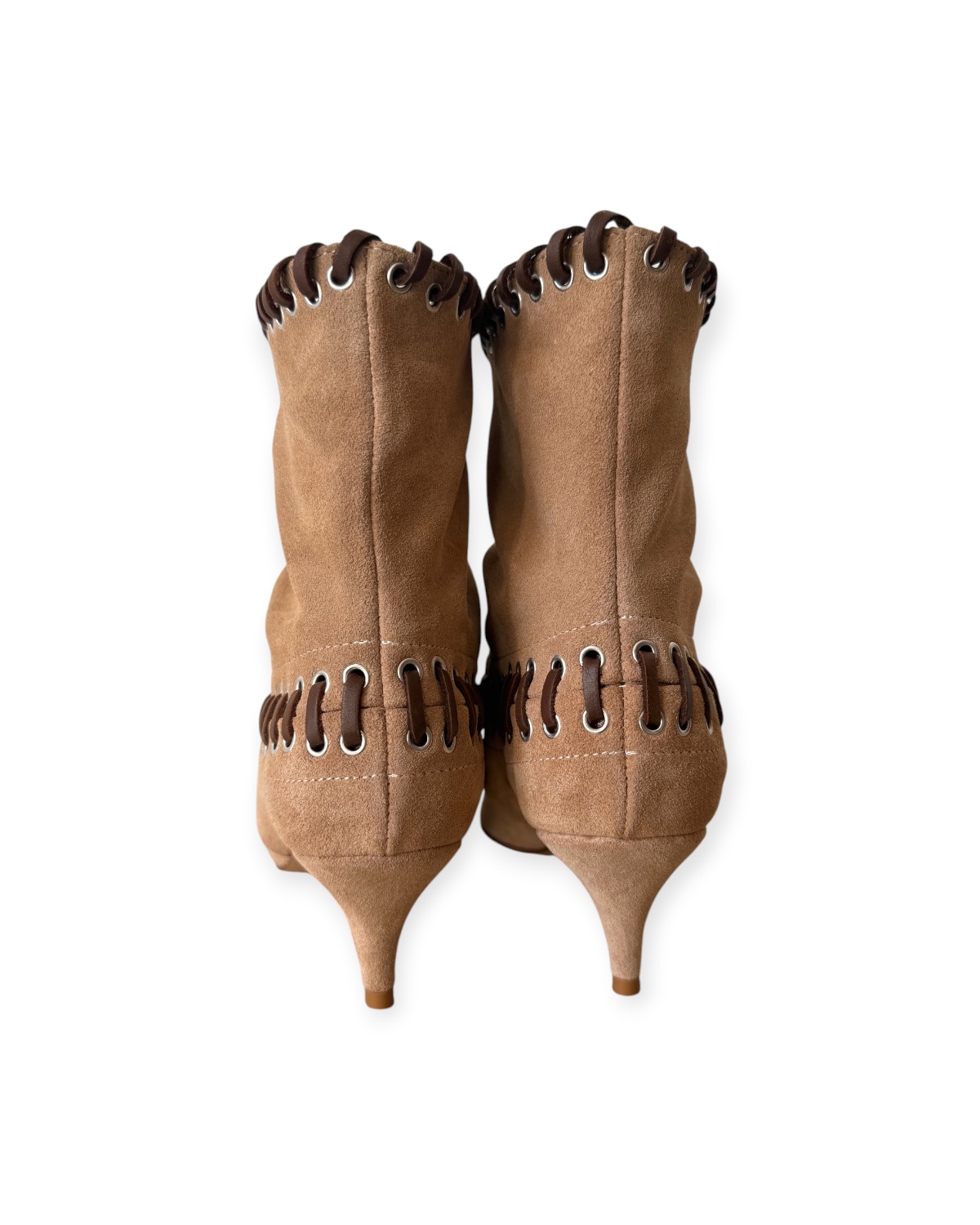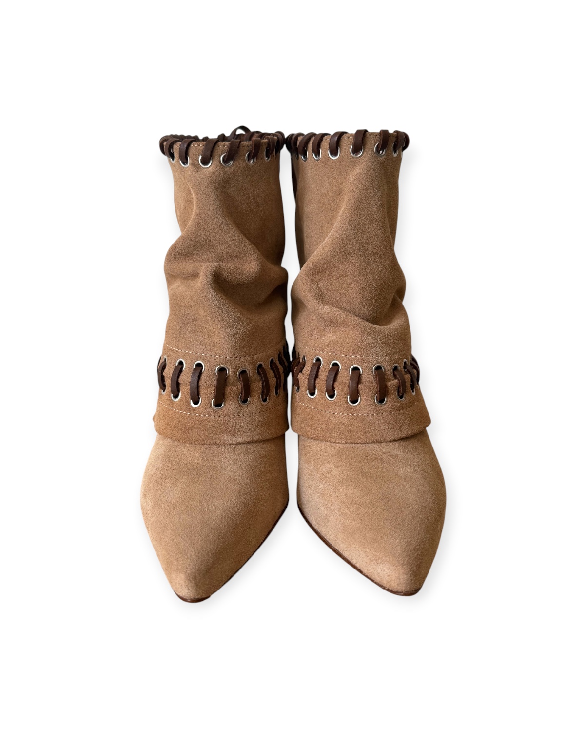 Lavorazione con laccetti intrecciati e occhielli metallici lungo il profilo superiore e centrale