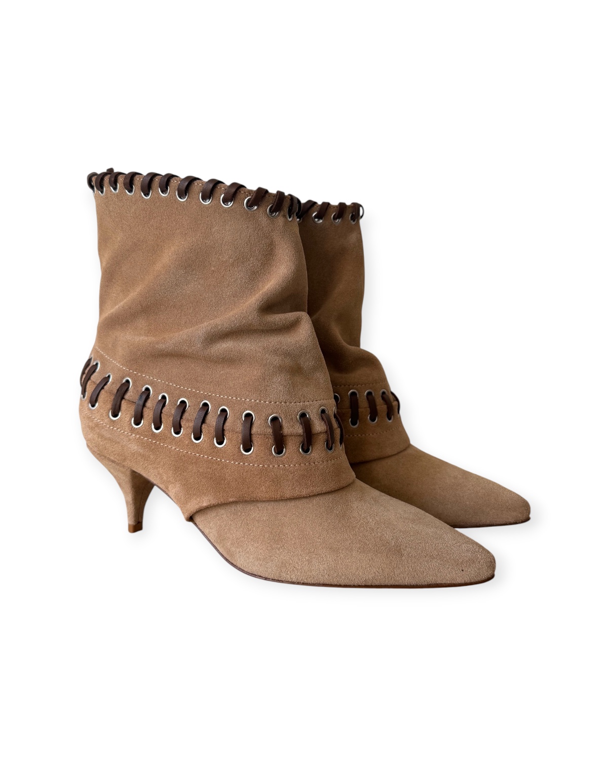 Stivaletto con punta affusolata, gambale medio morbido e tacco basso a rocchetto.