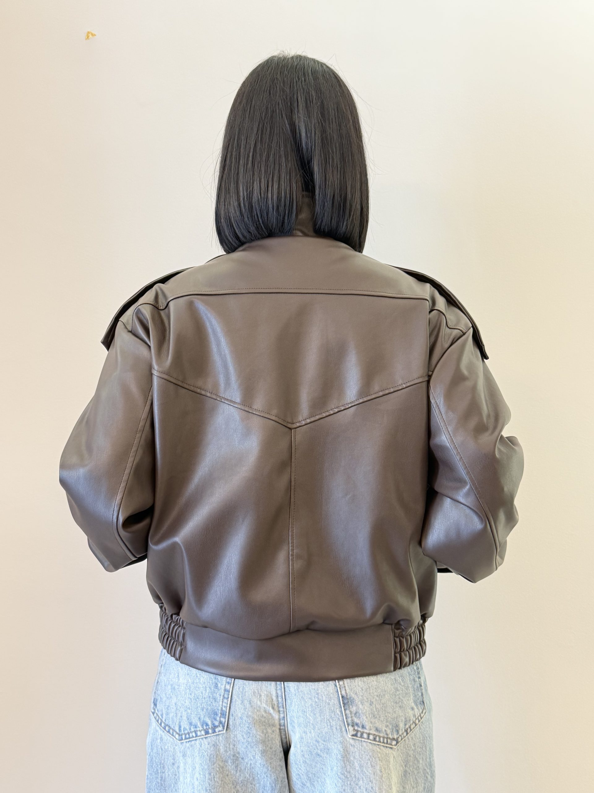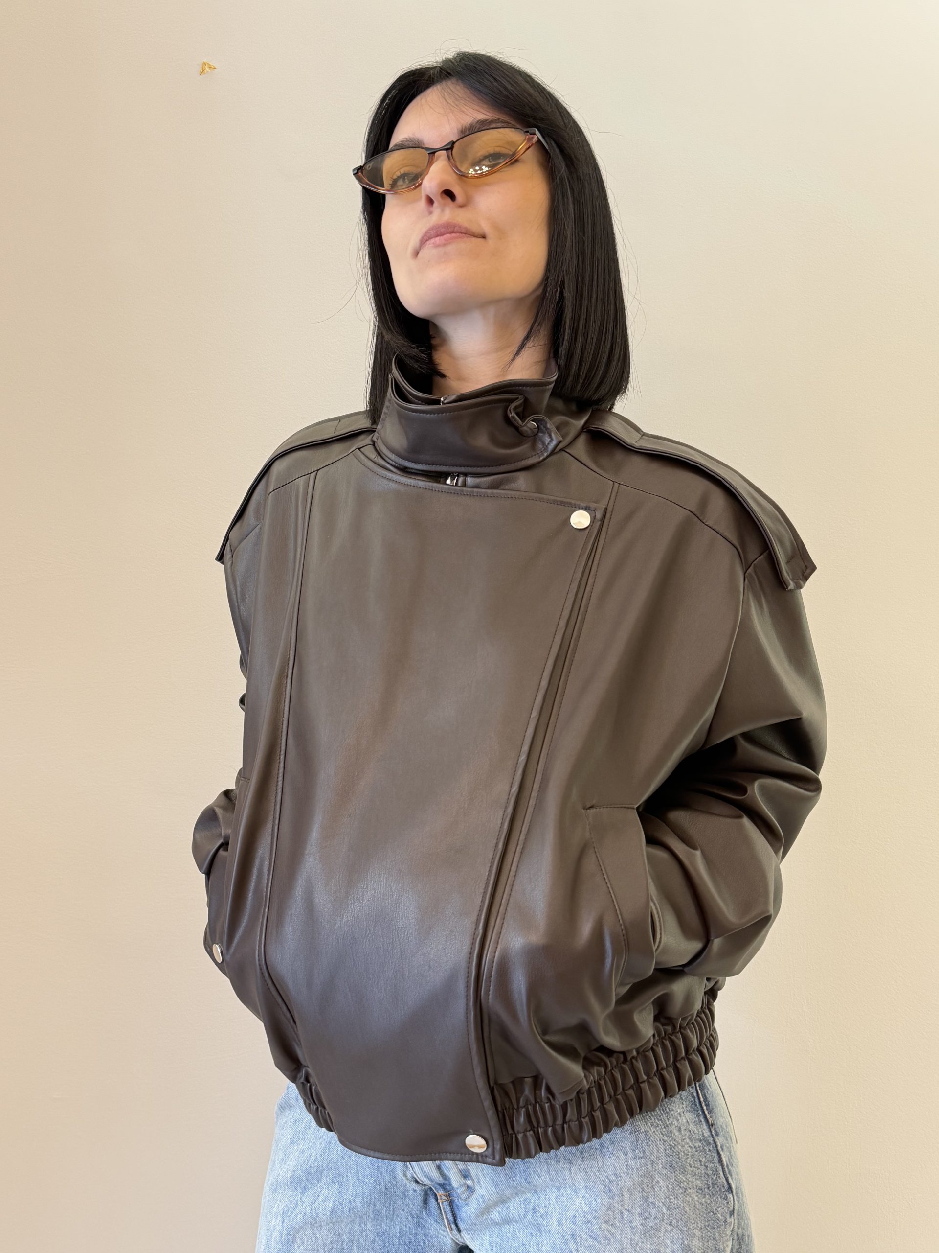 Vicolo Giacca bomber dal design contemporaneo caratterizzata da una linea ampia e strutturata. Il modello presenta un collo alto con chiusura a bottone, spalle leggermente scese e fondo elasticizzato che definisce la silhouette. Un capo dallo stile deciso, ideale per completare look moderni e urbani.