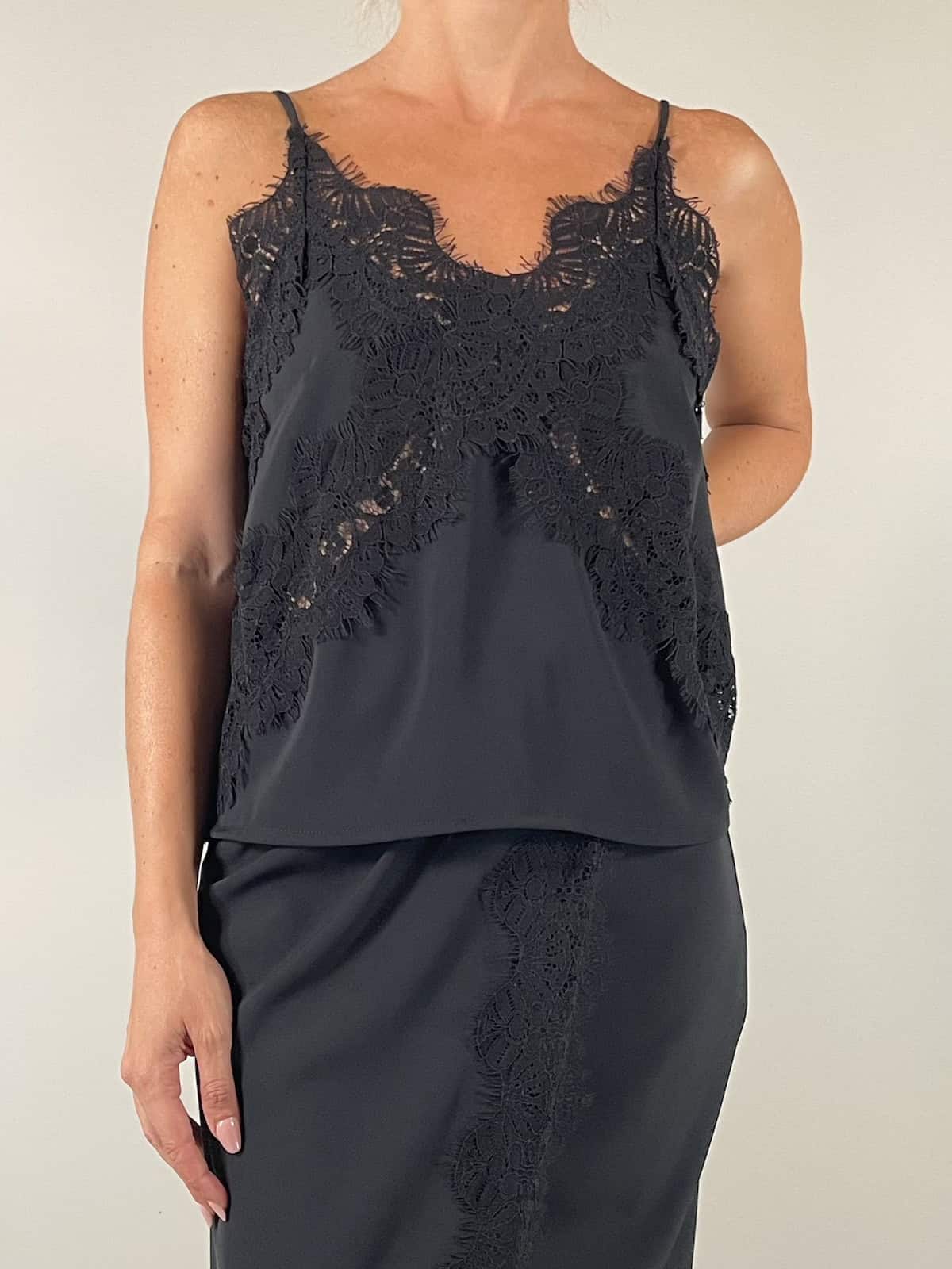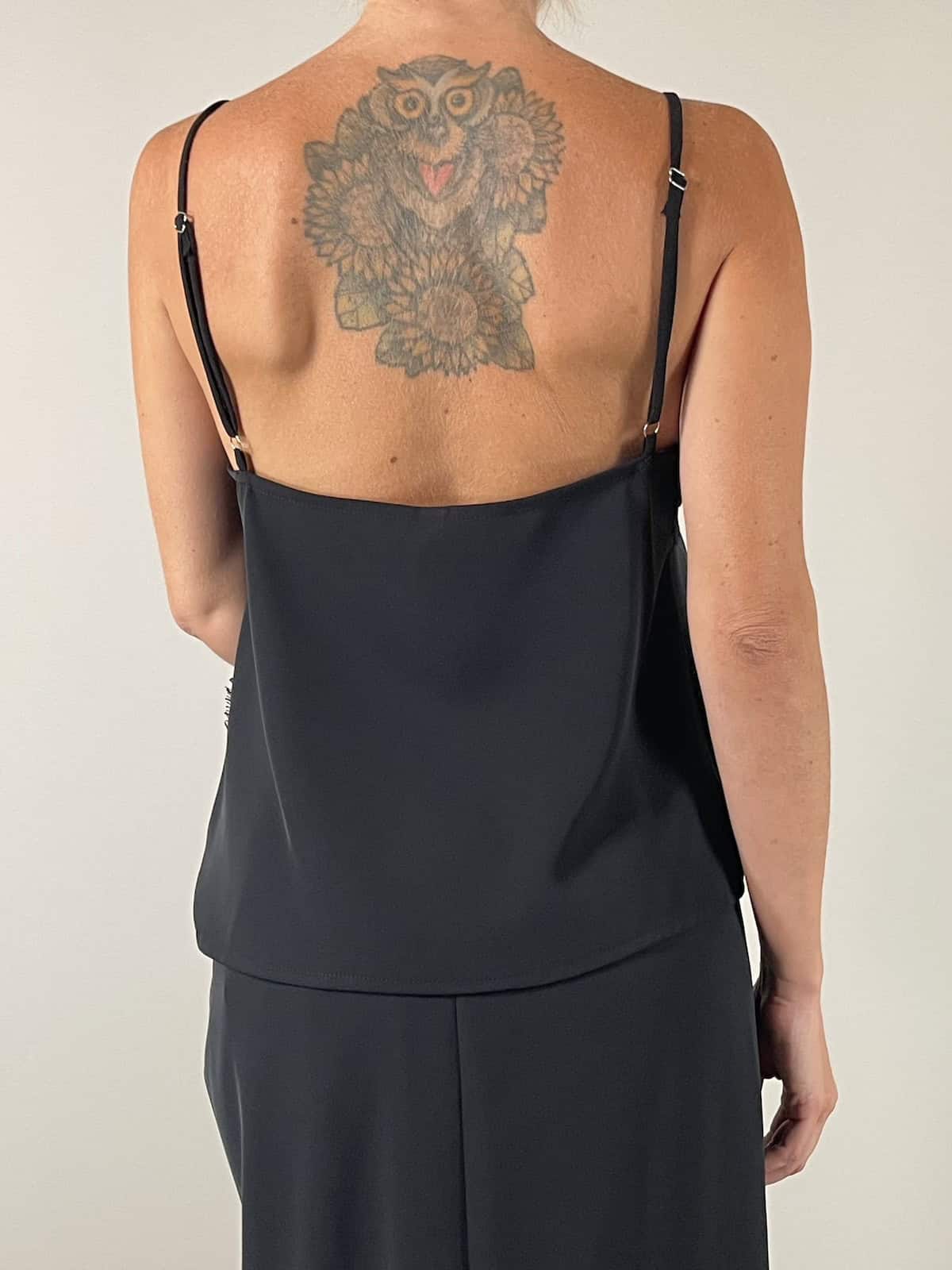 Top raffinato caratterizzato da una lavorazione in pizzo macramé che decora il davanti con un effetto vedo-non-vedo, valorizzando la femminilità con delicatezza. Il retro è liscio, con linea pulita e minimalista, ideale per bilanciare la ricchezza della parte frontale.
