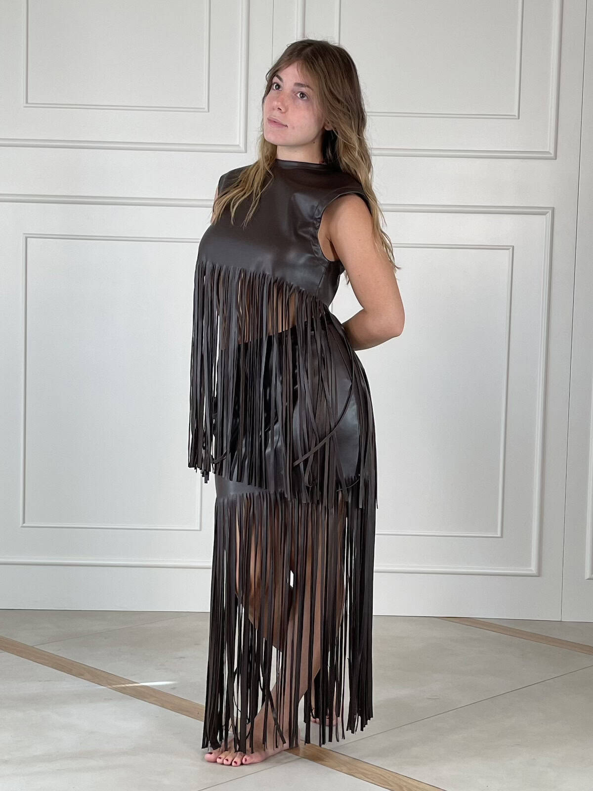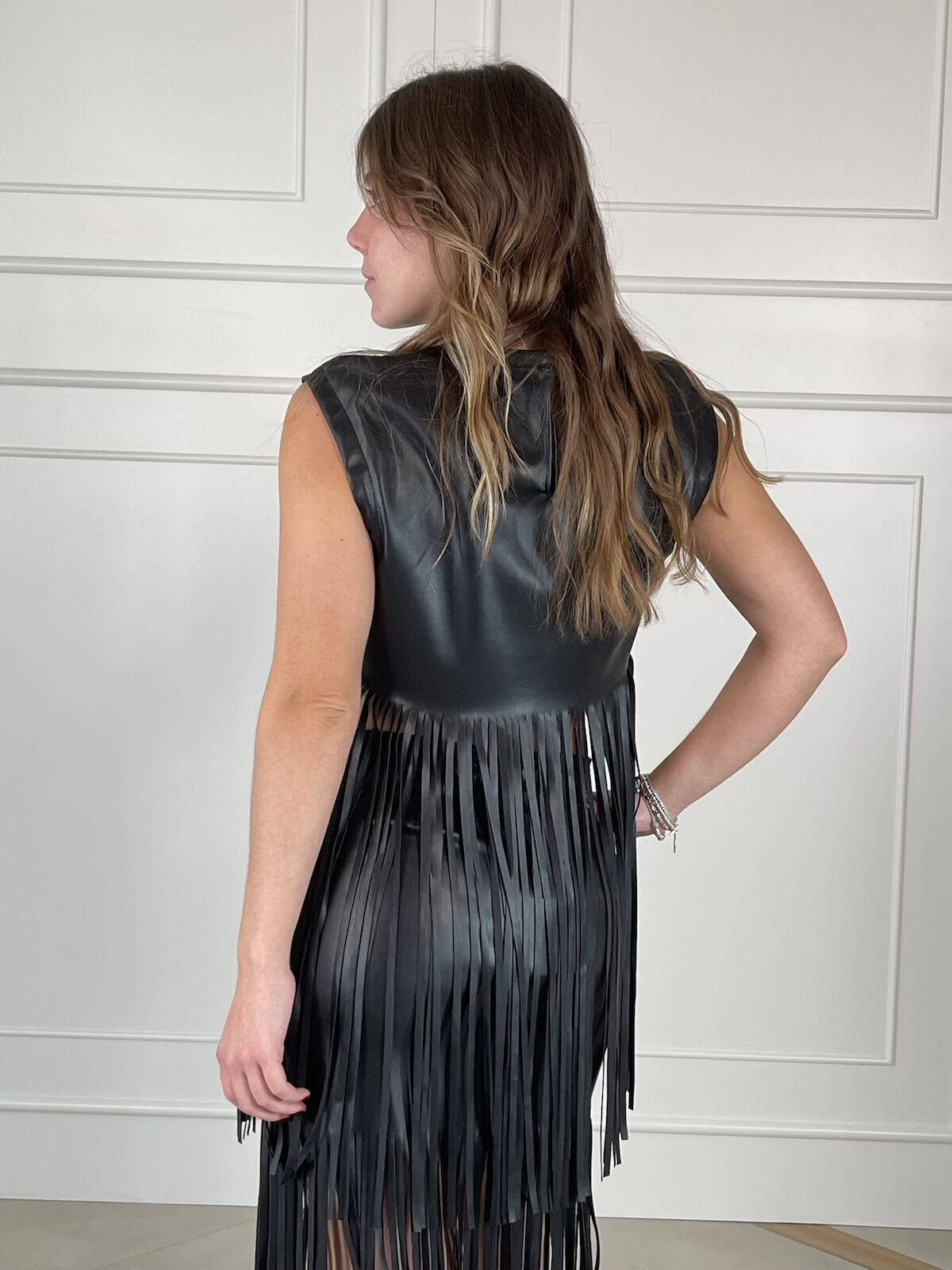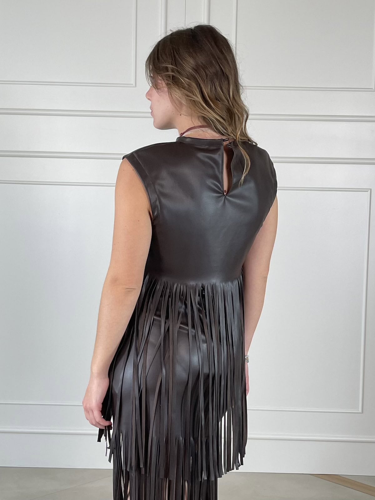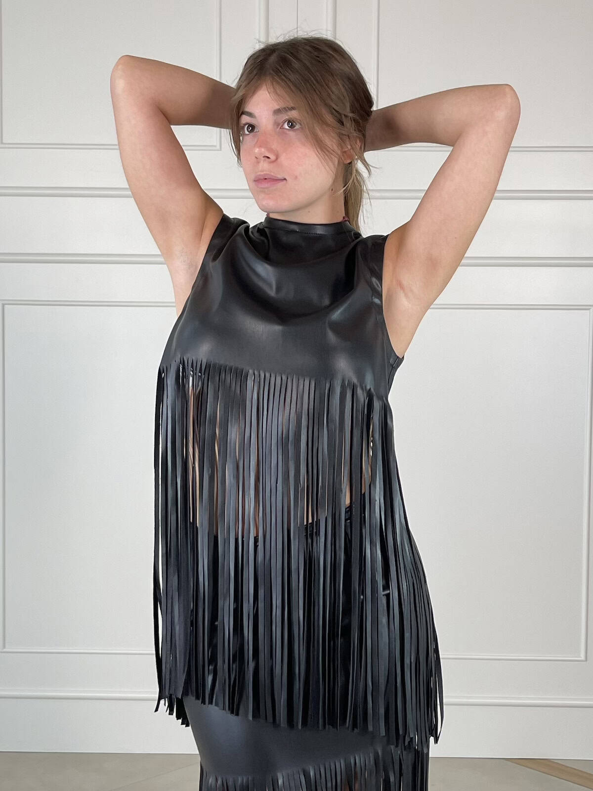 Tensione in top smanicato in eco pelle con lunghe frange. Chiusura a goccia sul collo e linea dritta